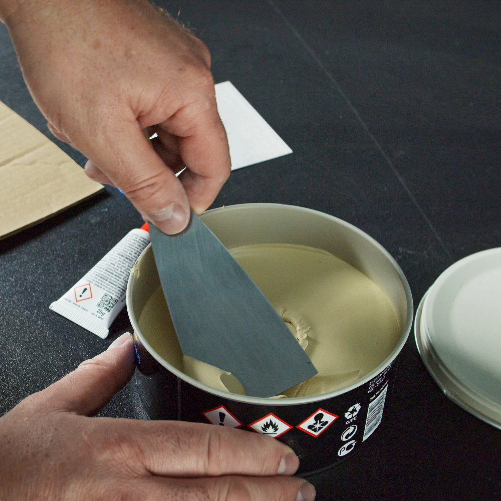 חומר פחחות פוליאסטר דו רכיבי מתקדם לתיקון חורים ואי סדירויות במשטחי פלדה, אלומיניום, עץ ובטון.